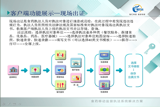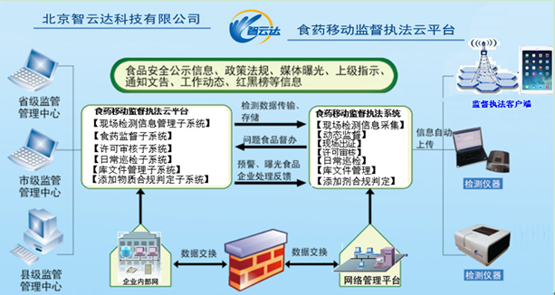 食藥移動監(jiān)督執(zhí)法系統(tǒng)是食品藥品監(jiān)督管理領(lǐng)域移動監(jiān)督執(zhí)法綜合服務(wù)系統(tǒng),主要用于食品藥品監(jiān)督管理部門移動監(jiān)管執(zhí)法使用。執(zhí)法人員可以手持客戶端現(xiàn)場檢測,錄像、錄音拍照等證據(jù)獲取,并依照法律法規(guī)對監(jiān)管對象進行動態(tài)出證、等級評審、許可審核和日常巡檢等業(yè)務(wù)工作處理,并上報處理結(jié)果數(shù)據(jù)。監(jiān)管人員根據(jù)執(zhí)法采集的數(shù)據(jù),及系統(tǒng)自動收集到的輿情信息,實現(xiàn)了食藥監(jiān)管部門對所轄區(qū)內(nèi)的食品安全問題重點監(jiān)管工作。