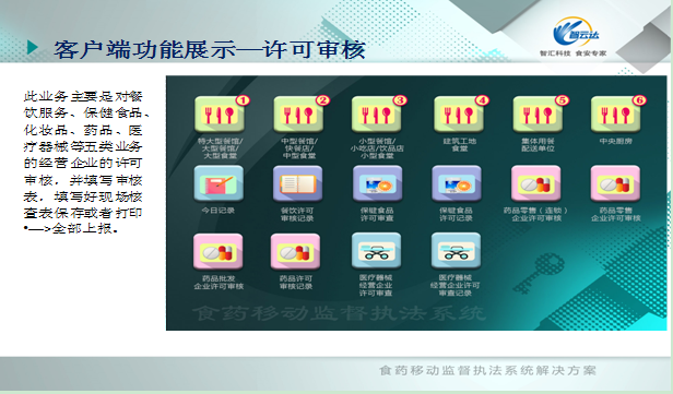 業(yè)務(wù)組成:分為云平臺中心管理系統(tǒng)和食安寶(移動執(zhí)法包客戶端)。主要業(yè)務(wù)監(jiān)管餐飲服務(wù)、保健食品、藥品、醫(yī)療器械、化妝品等五類業(yè)務(wù)。