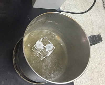 取1 mL蒸餾水于離心管中,再用0.2 mL塑料吸管取已攪拌均勻的蜂蜜1滴加到離心管中。 蓋上離心管蓋,放入沸水浴中的托架上加熱2分鐘后取出,上下搖動6次作為待測液。