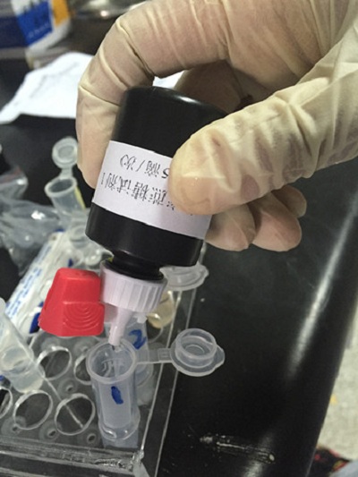 用0.2 mL塑料吸管取待測液滴加1滴到另一離心管中,滴入15滴蔗糖試劑1,蓋上管蓋,上下搖動6次。