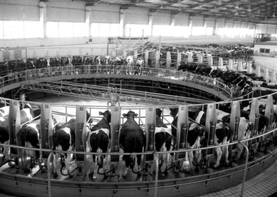 2010年12月10日,奶牛在內(nèi)蒙古蒙牛集團(tuán)轉(zhuǎn)盤式自動(dòng)擠奶生產(chǎn)線上等待擠奶。