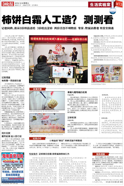 2016年12月08日9:00,北京智云達(dá)科技股份有限公司(以下簡(jiǎn)稱(chēng)“北京智云達(dá)”)與法制晚報(bào)攜手制作走進(jìn)勁松街道八棵松社區(qū)活動(dòng),為消費(fèi)者免費(fèi)檢測(cè)柿餅中是否含有葡萄糖和果糖、柿霜中是否含有淀粉。