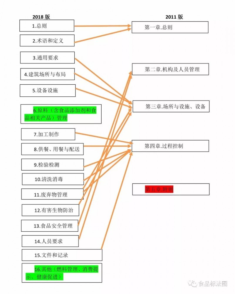 2018版《餐飲服務(wù)食品安全操作規(guī)范》分成了16個(gè)部分,分別是:1.總則、2.術(shù)語和定義、3.通用要求、4.建筑場所與布局、5.設(shè)備設(shè)施、6.原料(含食品添加劑和食品相關(guān)產(chǎn)品)管理、7.加工制作、8.供餐、用餐與配送、9.檢驗(yàn)檢測、10.清洗消毒、11.廢棄物管理、12.有害生物防治、13.食品安全管理、14.人員要求、15.文件和記錄、16.其他(燃料管理、消費(fèi)提示、健康促進(jìn))。