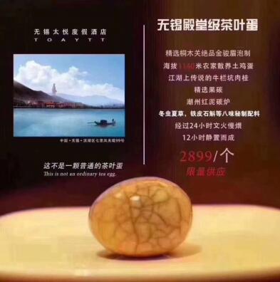 “精選桐木關絕品金駿眉泡制,海拔1140米農家散養土雞蛋,江湖上傳說的牛欄坑肉桂,精選果碳、潮州紅泥炭爐,冬蟲夏草、鐵皮石斛等八味秘制配料,經過24小時文火慢煨,12小時靜置而成的——無錫殿堂級茶葉蛋,2899元每顆且限量供應。近日,無錫太悅度假酒店公開銷售的茶葉蛋成為了網紅。