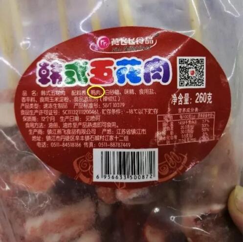 本周一,市民蔡先生在歐尚江東店遭遇了一次不愉快的購物體驗。“品名是韓式五花肉,可配料表里注明的是‘鴨肉’!”他告訴記者,自己是在收銀臺付完錢后才發(fā)現(xiàn)問題,找商家理論,卻被回了一句“誰規(guī)定五花肉一定是豬肉做的?”