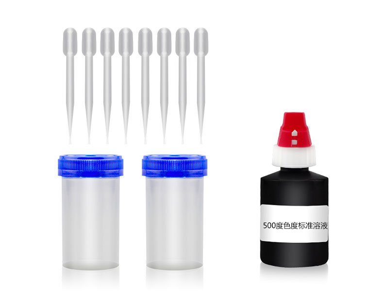 2. 為了增加色度的可視性,可取一只50mL塑料比色瓶,加入18滴(0.9mL)或24滴(1.2mL)500度的色度標準溶液,加入純凈水到30mL,相當于15或20度的色度標準對照溶液。另一支比色管,加水樣到30mL,與色度標準對照溶液比對。
