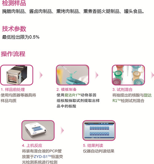 旋達R1?物種鑒定系列試劑,基于恒溫擴增技術平臺,以特別設計的2對特異性識別檢測靶標的獨有基因序列,能快速、準確地鑒定檢測出樣品中是否含有特定動物源成分,為識破食品摻假的違法活動提供有力依據。