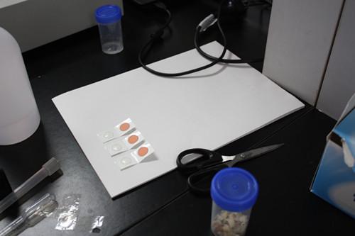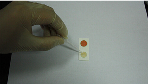 2、 取出農(nóng)藥殘留快速檢測(cè)卡,用滴管吸取2-3滴提取液,將提取液液滴加入到農(nóng)殘卡白色要片上。