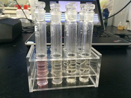 3、樣品管:吸取2mL樣品處理液于10mL比色管中,加入2mL山梨酸試劑一,加上蓋子,搖勻,于沸水浴中加熱7分鐘,立即加入2mL山梨酸試劑二,搖勻,繼續(xù)沸水浴加熱10分鐘,取出涼水冷卻3分鐘。