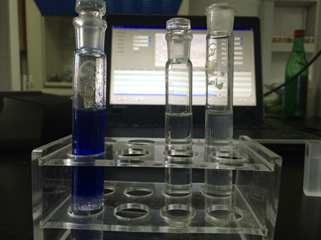 3、樣品管:取制備好的樣品液加入A溶液1mL,搖勻,加入三氯甲烷4mL,蓋上塞子,較為快速顛倒20次,靜置5min,取下層溶液進行檢測。