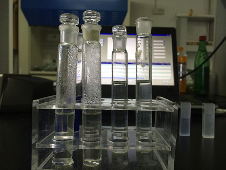 3、樣品管:吸取2mL樣品處理液于10mL比色管中,加入2mL山梨酸試劑一,加上蓋子,搖勻,于沸水浴中加熱7分鐘,立即加入2mL山梨酸試劑二,搖勻,繼續沸水浴加熱10分鐘,取出涼水冷卻3分鐘。