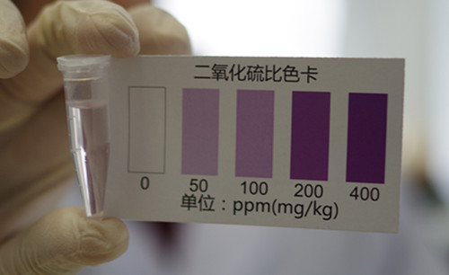 放置5分鐘觀察顏色變化,并與色卡對(duì)照,得出樣品中二氧化硫并未達(dá)到50 mg/kg,因此判斷二氧化硫含量未超標(biāo)。