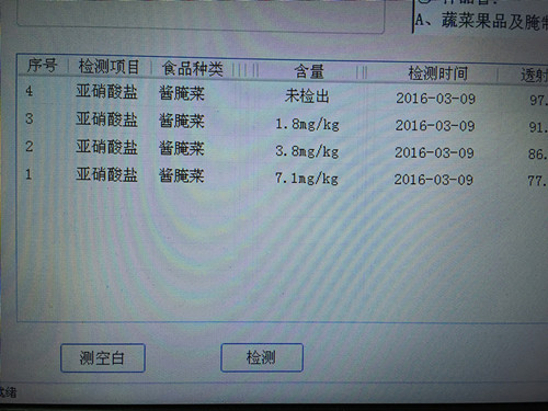 將裝有空白溶液及樣品液的比色皿放入儀器內(nèi)檢測,檢測結(jié)果如圖所示。從上到下分別為1號(hào)、3號(hào)、12號(hào)、14號(hào)樣品中亞硝酸鹽含量的檢測,結(jié)果顯示均符合國家標(biāo)準(zhǔn)。