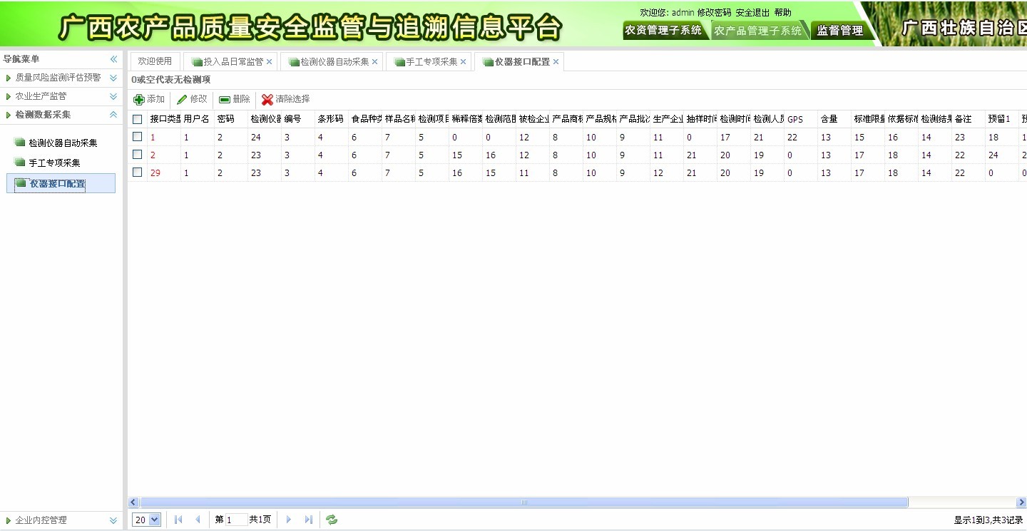 ? 抽檢信息管理:行業(yè)例行監(jiān)測(cè)抽檢,專項(xiàng)風(fēng)險(xiǎn)監(jiān)測(cè),所含信息包括產(chǎn)地、生產(chǎn)者、品種、檢測(cè)結(jié)果、處理情況、檢測(cè)員等信息。如圖2-3所示